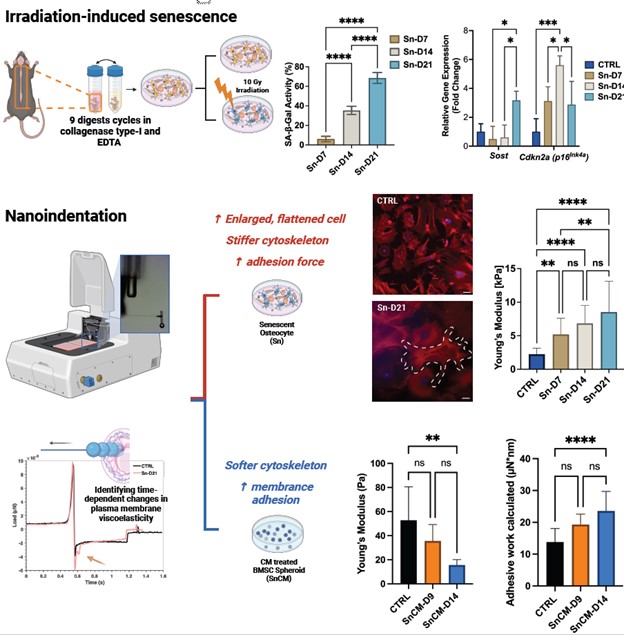 Senescent osteocytes 21 days post-irradiation had upregulated expression of p16Ink4a and Sost, an inhibitor of the Wnt/β-catenin signaling pathway. Of note, a significant increase in Young’s modulus of the osteocytes was observed on days 7, 14, and 21 post-irradiation compared to the control group, demonstrating cytoskeletal stiffening in senescent osteocytes. Senescent osteocytes also exhibited higher minimum adhesion forces and delayed recovery phase post-indentation compared to their healthy counterparts. Contrastingly, BMSC spheroids demonstrated a decreasing trend in Young’s modulus over time and an increase in membrane adhesion when treated with senescent osteocyte CM.