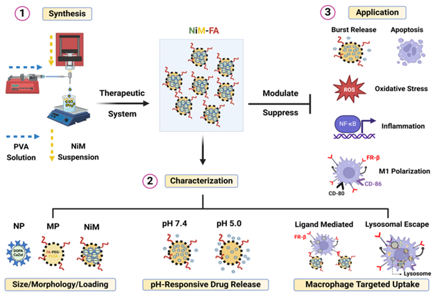 To produce the drug delivery complex, Zol was complexed with calcium to form nanoparticles (CaZol-NP) using reverse emulsification. NiM were formed by loading CaZol-NP into polyethylene glycol-polylactic-co-glycolic acid (PEG-PLGA) MP using coaxial flow phase separation method. The size of the CaZol-NP and NiM and encapsulation were confirmed by electron and fluorescence microscopy. The sustained release of Zol from the NiM was measured at predetermined time intervals under both neutral and acidic conditions. To create a targeted drug delivery system, folic acid (FA) was conjugated to PEG-PLGA polymer to create NiM-FA. RAW264.7 macrophages were treated with lipopolysaccharides prior to culture with NiM-FA for 4 hours. Uptake and lysosomal colocalization of NiM-FA was characterized by confocal imaging flow cytometry. The suppression of the inflammatory cytokine nuclear-factor kappa-beta was used to assess the influence of NiM-FA on LPS-induced inflammation, and cytotoxicity of NiM-FA was assessed with an MTT assay.